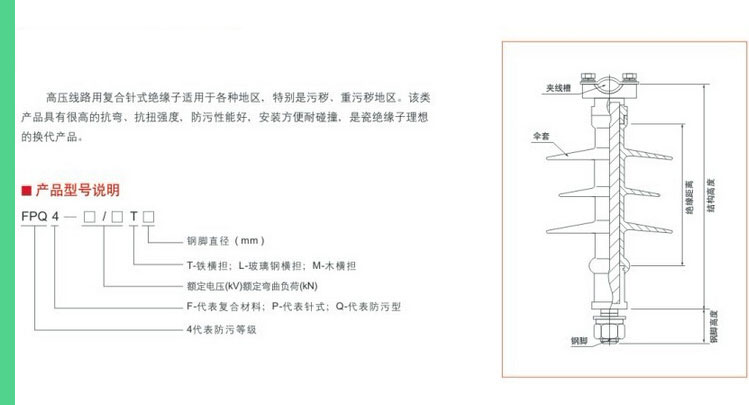 FPQ-10/5T20復(fù)合針式絕緣子復(fù)合針式絕緣子具有很高的抗彎曲,抗沖擊性、抗震性和防爆性能優(yōu)越。內(nèi)絕緣可靠、重量輕,是傳統(tǒng)電瓷的理想換代產(chǎn)品。