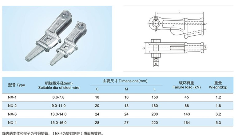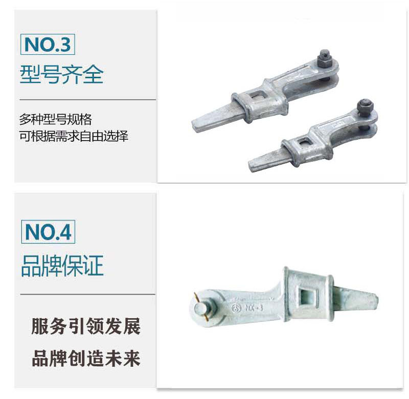2)、錨固金具,又稱緊固金具或耐線線夾。這種金具主要用來緊固導(dǎo)線的終端,使其固定在耐線絕緣子串上,也用于避雷線終端的固定及拉線的錨固。錨固金具承擔(dān)導(dǎo)線、避雷線的全部張力,有的錨固金具變作為導(dǎo)電體