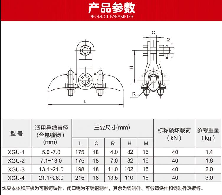 XGU懸垂線夾常有的定型產(chǎn)品,現(xiàn)在保留了U型螺栓式樣(通常叫船型線夾),它是由掛架U型螺栓,可鍛鑄鐵制造的線夾船體、壓板組成。另一種就是預(yù)絞式懸垂線夾。懸垂線夾用于將導(dǎo)線固定在直線桿塔的絕緣子串上,或?qū)⒈芾拙€懸掛在直線桿塔上,亦可用于換位桿塔上支持換位導(dǎo)線以及耐張轉(zhuǎn)角桿塔跳線的固定。