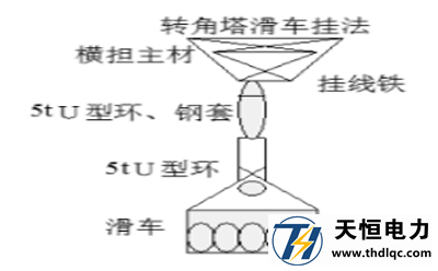 1、耐張塔邊相的滑車用U型環(huán)、Φ19.5(長(zhǎng)2m)鋼套掛在導(dǎo)線橫擔(dān)靠掛線點(diǎn)附近的主材上,掛具長(zhǎng)度以不會(huì)撞擊瓷瓶、鐵塔橫擔(dān)為好。