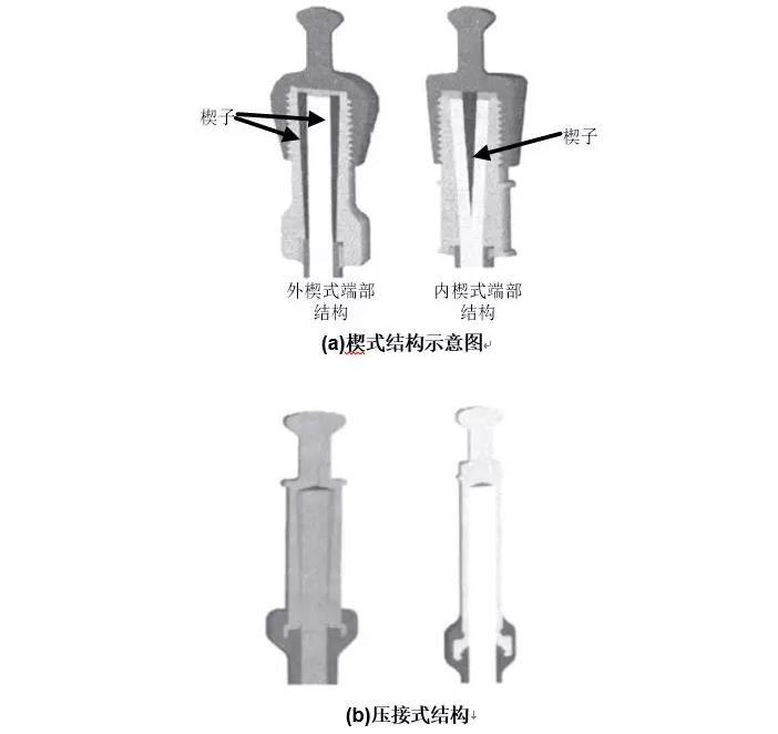 復(fù)合絕緣子端部連接方式可分為楔式、壓接式。楔式可分為外楔式與內(nèi)楔式。